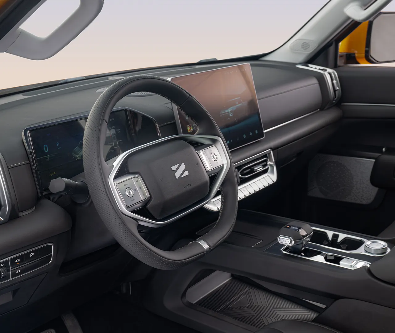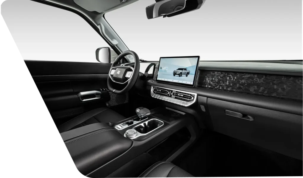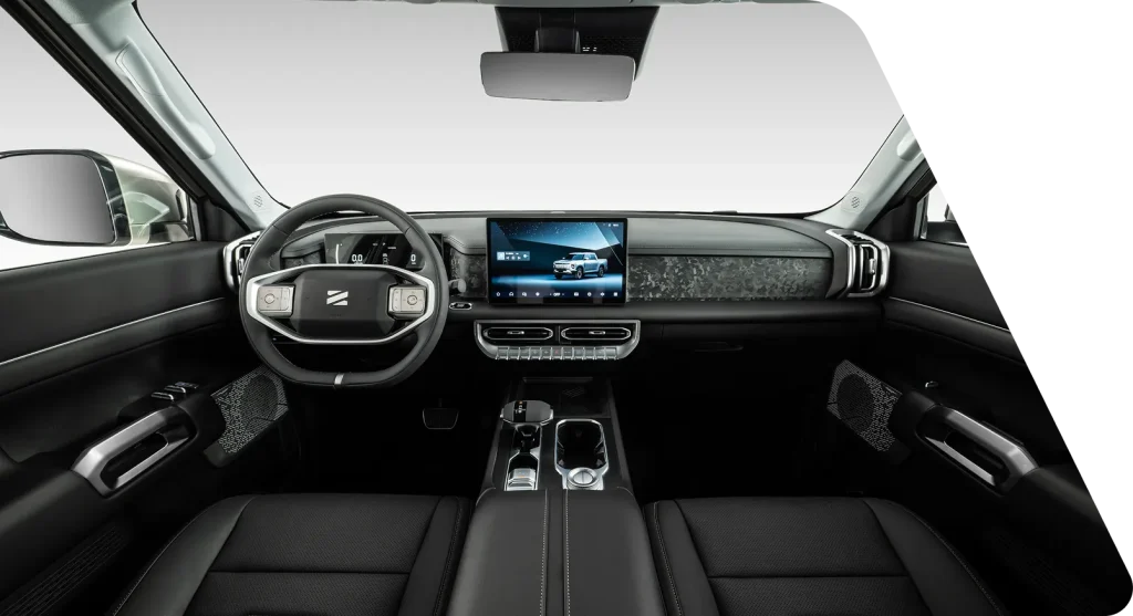 The Dongfeng Z9 cockpit is a bold and purposeful command centre designed to keep the driver fully in control across every terrain and condition. A premium leather-wrapped multifunction steering wheel and fully digital 12.8-inch instrument cluster deliver a modern and deeply immersive driving experience from the very first moment. Every switch, every button, and every control is precisely positioned for effortless reach, ensuring the driver stays focused and completely in command at all times. Warm amber interior lighting, soft-touch premium surfaces, and rugged yet refined trim materials create a cabin that is as tough as it is comfortable. The driver-focused layout eliminates distractions and puts every essential function intuitively within reach for confident off-road and on-road driving.